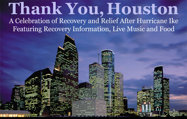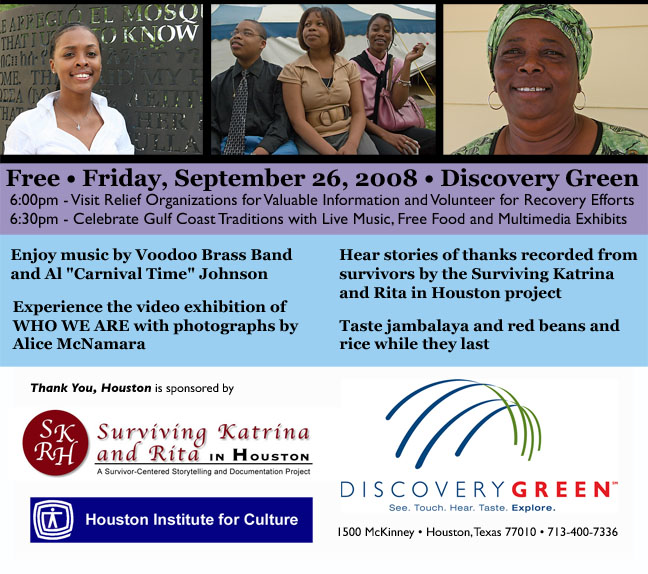![]() ![]() Houstonians responded with generosity after hurricanes Katrina and Rita. Now Houstonians have responded generously to one another after Hurricane Ike. "Thank you, Houston" will take place on Friday, September 26. Beginning at 6:00pm, aid and service agencies will distribute information and answer questions that Houstonians may have about Hurricane Ike relief. Houstonians may also connect to volunteer efforts to provide additional relief and recovery in Houston and surrounding counties. From 6:30 to 9:00pm, Houstonians will be treated to brass band music and red beans and rice and jambalaya while it lasts. Members of the public are encouraged to bring non-perishable "ready-to-eat" food items for the Houston Food Bank, to assist with their hurricane relief efforts. ORGANIZATIONS TO PROVIDE RECOVERY AND RELIEF INFORMATION Organizations that can provide information to Houstonians who still need assistance with housing, health and other matters should plan to attend and distribute information to the community. ORGANIZATIONS TO CONNECT VOLUNTEERS TO HURRICANE-RELATED PROJECTS As Houston nears recovery, there are still many needs in the city and in neighboring communities that were hard hit by the hurricane. Recovery and relief efforts will be ongoing for weeks to come. Organizations that will be involved in hurricane-related projects in the future should attend and recruit volunteers for their efforts. Contact info@houstonculture.org to reserve a table at Discovery Green. "Thank You, Houston" was originally planned as a commemoration of Houston's life-saving hospitality to Katrina and Rita survivors and a celebration of Gulf Coast traditions through music, food and survivors' stories. Following Hurricane Ike it has been modified to celebrate Houstonians' support for their neighbors in the days after the storm. View photos and hear excerpts from the Surviving Katrina and Rita in Houston project: HOUSTON INSTITUTE FOR CULTURE DONATE SEARCH info@houstonculture.org |