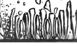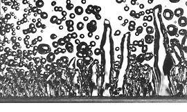 THE VAPOR JETS "Following college, the most idealistic of fine artists become waiters and bank tellers," Lacy said, half joking. After his graduation in 1989, Lacy entered the world his civil engineer father first introduced him to as a surveyor working long days through the hot Oklahoma summers. His new job with the UH Cullen College of Engineering would present more mental than physical challenges. Despite years of study in journalism and fine arts, he lacked technical training. "Fine arts prepared me for critical analysis, conceptual thinking, issues, aesthetics, connotation, and so on, but didn't prepare me with the technical ability necessary to elevate my standards." "Photography is a product of light and time, with almost infinite variables, and it requires extensive technical knowledge that photography professors usually cannot teach," Lacy explained. For the engineering faculty, he was required to record data from experimental processes invisible to the human eye. He calculated that a mechanical engineering experiment being conducted under Dr. John Lienhard's supervision would require scientific lighting equipment to make a capture exposure with a duration less than 1/200,000th of a second. The resulting still images of vapor jets, containing information necessary to effectively cool dangerous energy sources, had not previously been documented with photography or video. |
