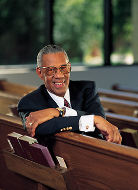 ![]() IN THE PHOTO ABOVE Lacy created a high-resolution portrait (rendering detail which cannot be detected in a low resolution computer monitor) of Reverend Bill Lawson of the Wheeler Avenue Baptist Church for high-quality and large-scale reproduction. Lacy said, "A person who has committed so much of himself to community service and earned the respect of the community, like Reverend Lawson, deserves to be photographed by a photographer who is knowledgeable and willing to work to make the best possible image." |
