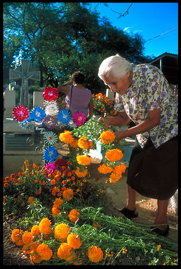 A woman prepares marigolds for a family burial site in a cemetery near Oaxaca. Cleaning and preparing the grave site for the return of loved ones is an important activity during El Dia de los Muertos.